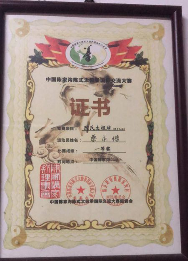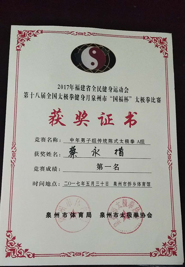 蔡永楷生于1970年,2000年拜陈氏太极拳第十二代传人蔡裕能师父为师,学习陈氏太极拳拳术及器械;学习期间,详细记述了陈氏太极拳练意、练气、练力、走气、走劲,太极内功、站桩太极球练法、大杆练法、推手等。至目前坚持每日早晚练拳练功,使武术技艺有了进一步的提高。 2000年起至今,蔡裕能师父指导下,精心授教青少年陈氏太极拳,辅导培养爱好者及学生近千人。2016任陈家沟太极拳协会晋江分会副会长。荣获陈家沟陈氏太极拳国际交流大赛太极球项目金牌;2017年荣获“国福杯”泉州市第十八届太极拳比赛传统陈式太极拳项目金牌和陈式太极剑银牌;2019年5月荣获“国福杯”泉州市第二十届太极拳比赛陈式太极双刀 金牌和陈式太极拳新架二路铜牌。