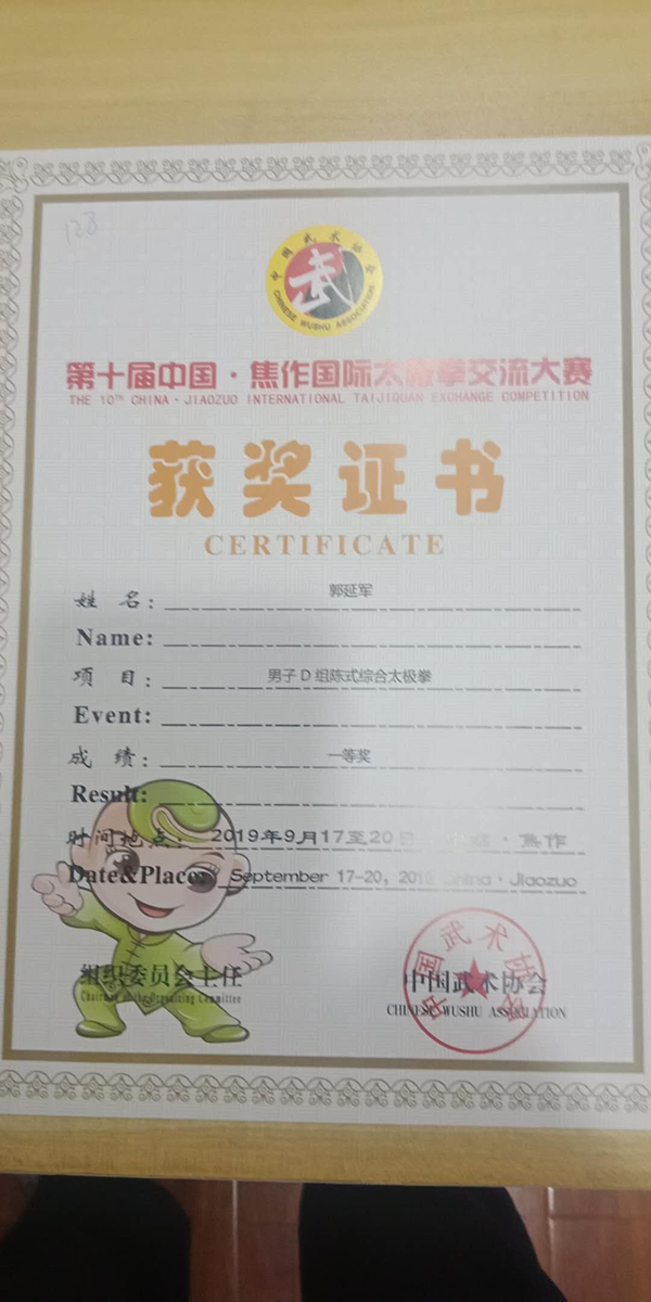 郭延军,1985年8月开始习练太极拳,2011年3月开始从事太极拳教学工作;2016年10月拜太极拳名家董丰电为师,对太极拳拳理拳法进一步提高学习;为中国武术协会会员;曾在董丰电太极养生武术院多个分站担任站长职务;在2017年陈家沟家乡赛中夺得陈式太极拳综合套路32式金牌、陈式太极剑银牌;同年焦作国际太极拳交流大赛中荣获陈式太极拳综合套路及陈式太极剑双金牌;2019年11月份,在陈家沟举办的全国太极之乡家乡赛总决赛中再次荣获男子D组陈式太极拳、太极剑双金牌。2019年“搿手杯”第五届国际太极拳网络视频大赛荣获成人组陈式太极拳一等奖、成人组陈式太极器械一等奖。
