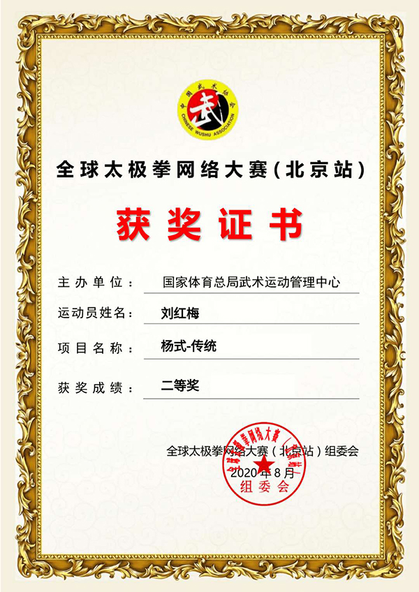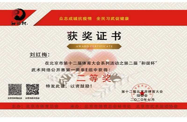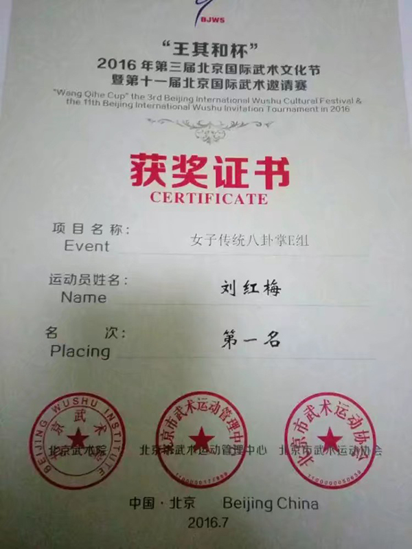2016年,第三届“王其和”杯北京国际武术赛获女子E组八卦掌类金牌。