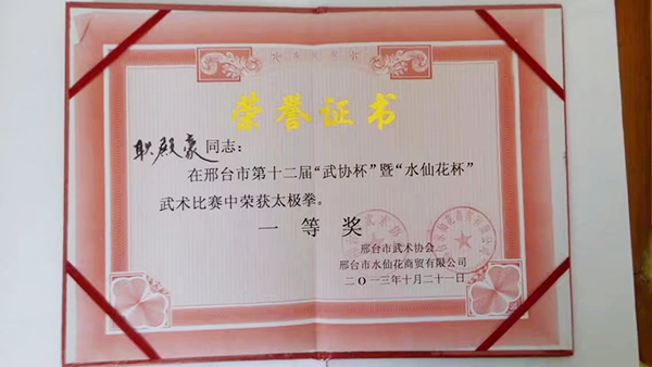 2013年获邢台市武协杯水仙花杯42式太极拳一等奖夕阳美扇二等奖