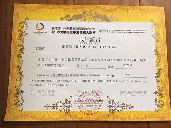 2015年苏州市太极拳团体赛第一名,陈式太极拳个人比赛一等奖