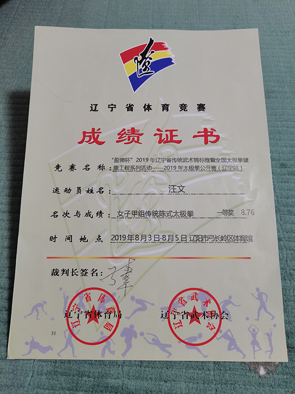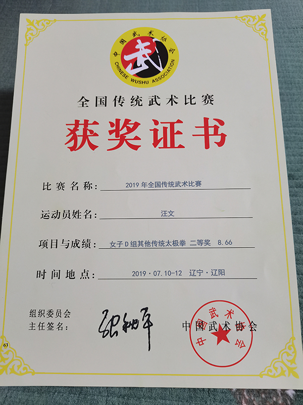汪文,2010年开始跟随父亲(汪荣安、陈式太极拳第十一代传人、陈式心意混元太极拳第二代传人、少林寺俗家门徒 关东支派第三十一代弟子。)习练太极拳。2015年担任抚顺市劳动公园太极拳辅导站教练;2016年到抚顺市妇女大学教授太极拳;2018年任抚顺市市府小树林太极拳培训站教练;2020年任国际混元太极拳抚顺东部培训中心主任兼教练。并在2019年担任抚顺市武术协会副主席一职。