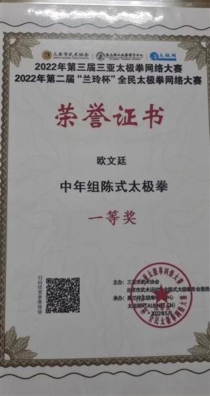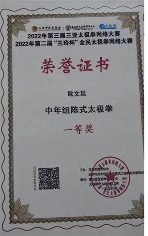 2022年第三届三亚太极拳网络大赛2022年第二届“兰玲杯”全民太极拳网络大赛荣誉中年组陈式太极拳一等奖、陈式太极器械一等奖。