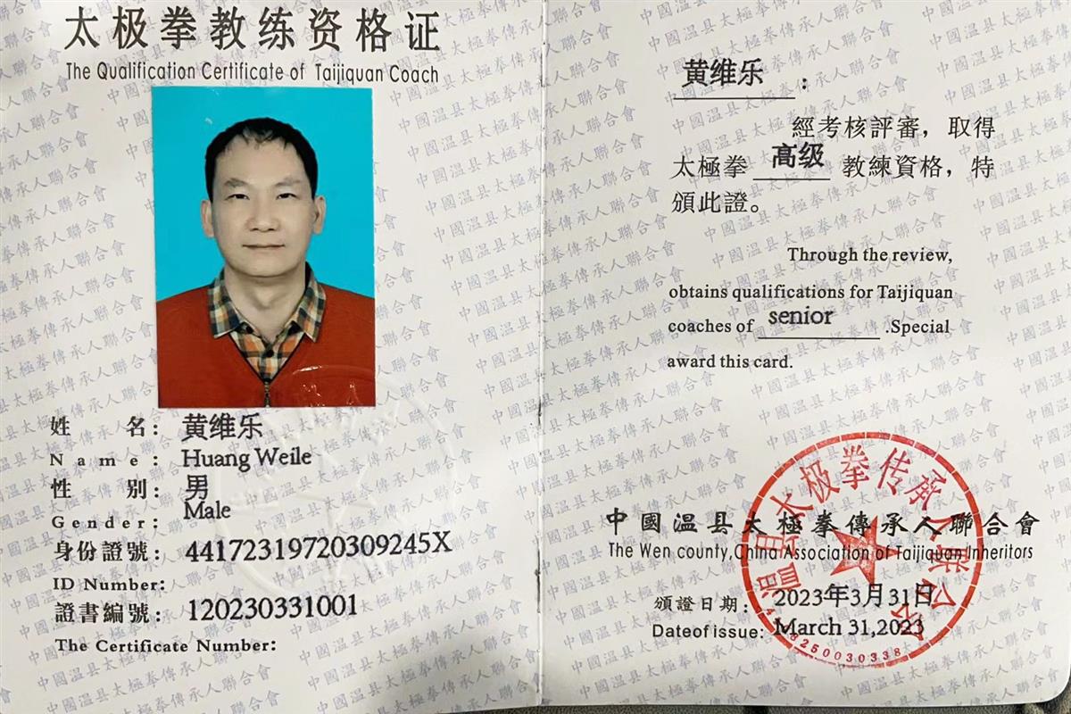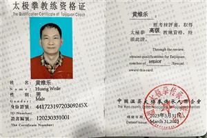 黄维乐,男,1972年3月出生于广东省阳江市,2015年开始学习陈式太极到现在,陈式太极拳传承人,师承郑利东,作为一个传承人,今后要从艺为民,恪守门规,扶携同仁,弘扬太极。