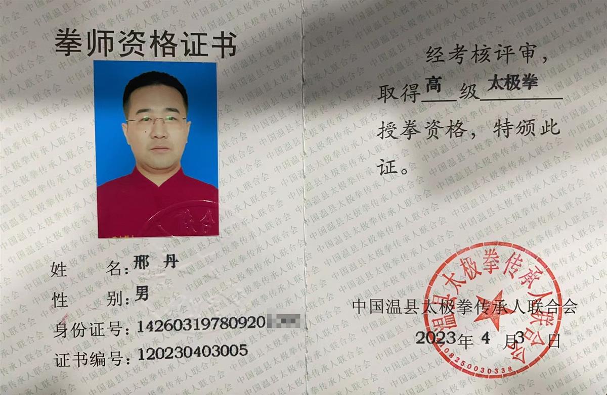 2023年4月获得太极拳高级教练、太极高级拳师资质。