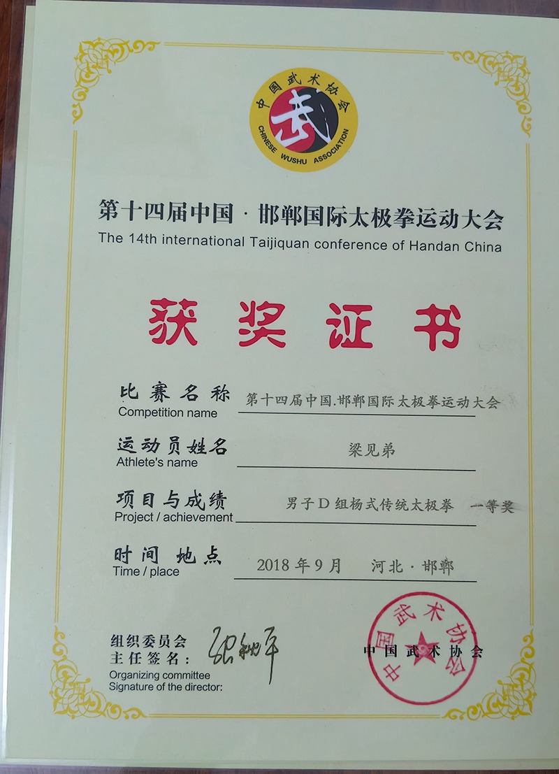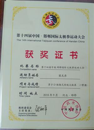 2014年6月被贾保安师父提名前往河北参加第十二届中国.邯郸国际太极拳运动大会,荣获男子中年组杨式太极器械三等奖,男子中年组杨式太极拳二等奖;