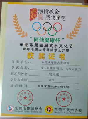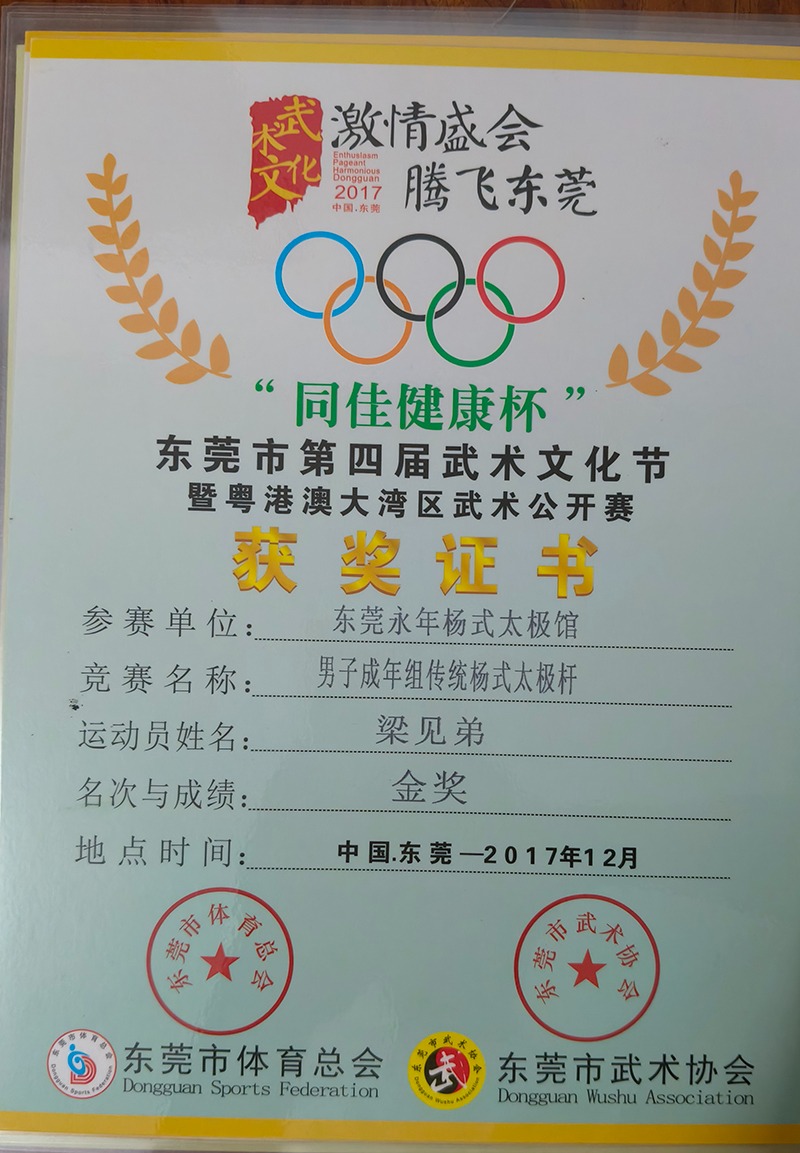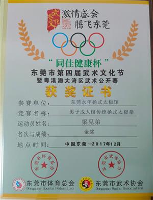 2017年12月参加东莞市第四届武术文化节暨粵港澳大湾区武术公开赛,荣获男子成人组传统太极拳金奖、男子成人组传统杨式太极杆金奖、成人组集体项目传统杨式太极十三刀金奖;